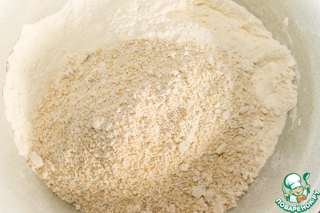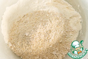 В глубокой миске смешиваем просеянную муку и измельченные хлопья.
