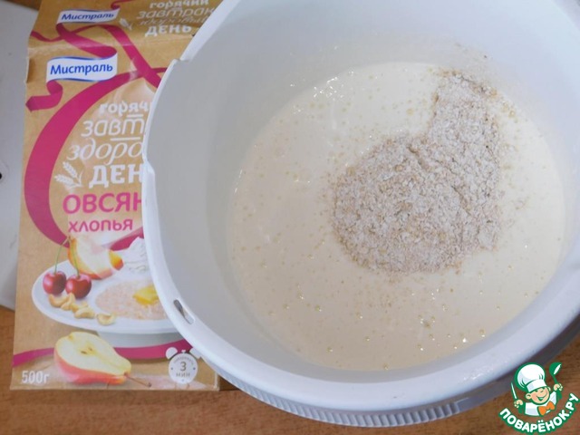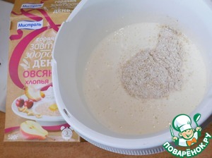 Яйца взбиваем с сахаром до бела. Добавляем к ним измельченные овсяные хлопья.