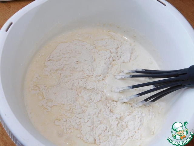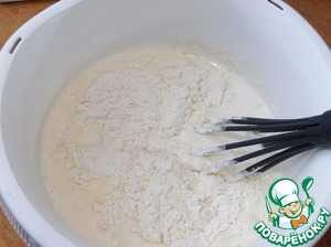 Венчиком вмешиваем растительное масло, молоко, муку, соду.