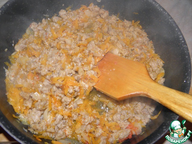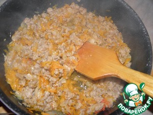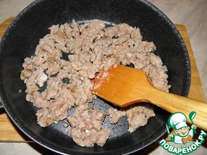 Обжариваем фарш на сковороде в 1 ст. л. растительного масла. Растираем мясо, разбивая крупные комочки. Жарим около 5 минут.