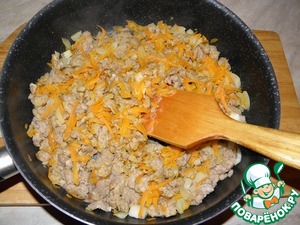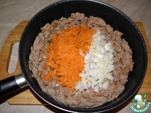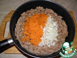 Раздвигаем фарш к стенкам сковороды и в центр добавляем нарубленный лук и тертую морковь. Слега обжариваем овощи в центре посуды