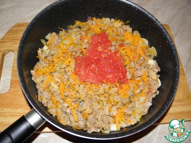 Помидор от шкурки очищаем и превращаем в пюре (можно заменить томат пастой с водой). Измельченный томат выливаем в сковороду к фаршу.