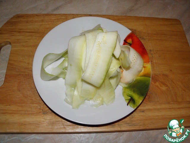 Пока овощи с фаршем тушатся в сковороде подготавливаем кабачки. Моем, сушим, очищаем от шкурки. Разрезаем кабачок вдоль на две части, из каждой удаляем семена при помощи ложки, овощечистки или ножа — кому как удобнее, обрезаем концы. На этой стадии как раз и определяется вес кабачков. Снимаем кабачковую мякоть слой за слоем.