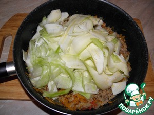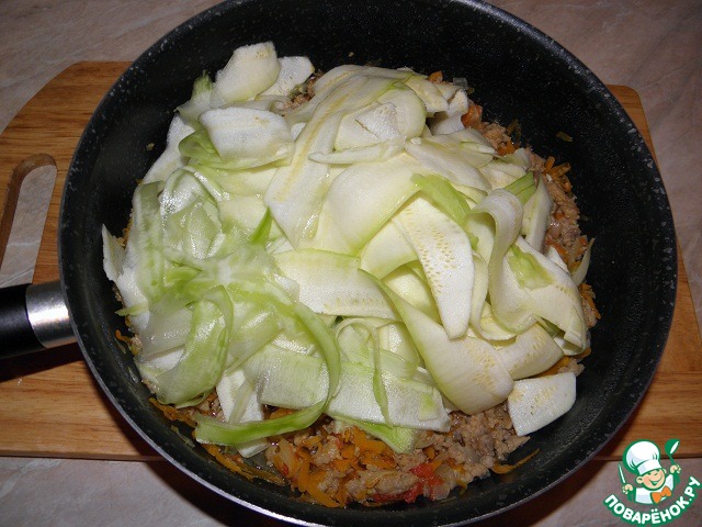 Выкладываем нарезанные кабачки к фаршу в сковороду, тщательно вмешиваем их в соус для равномерного распределения. Нам осталось тушить кабачки всего лишь 5-7 минут.