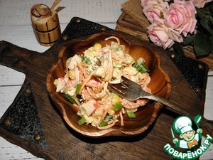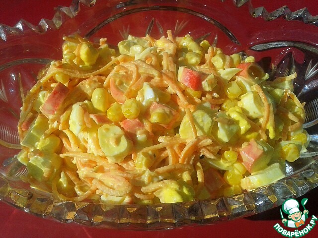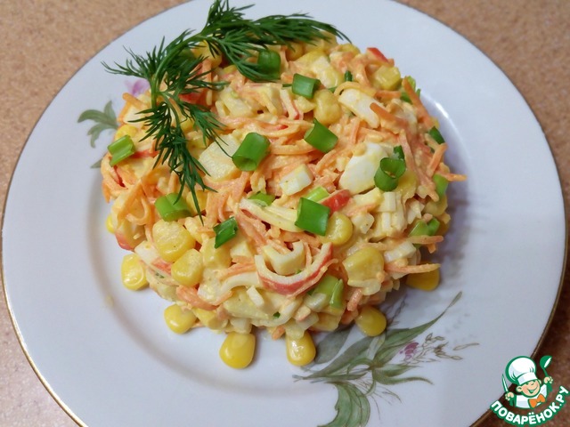 Машенька, очень понравилась идея салатика) я его немного изменила, так как зелёного лука не было и крабовых палочек что-то не хотелось, хотелось посвежее чего-то! Заменила головкой красного лука и добавила салат айсберг, морковку по-корейски делала сама. Вышло ну ооооооочень вкусно и интересно! Спасибо большое за рецепт!!!