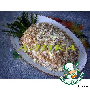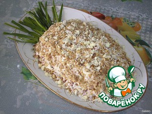 Растолочь грецкие орехи, чтобы были кусочки с пол горошины. Посыпать сверху орехами и тертым желтком. Украсить хвостиком из лука. Салат готов.