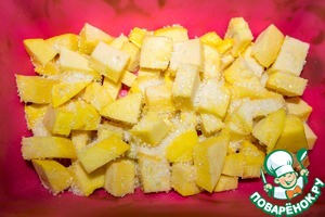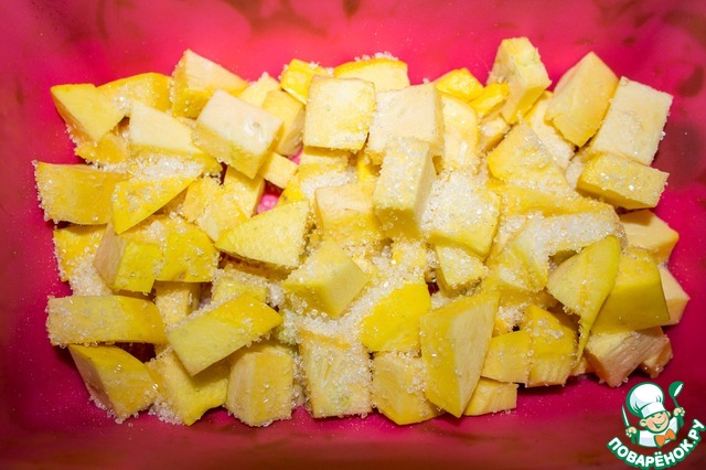 • Тыкву моем, чистим, нарезаем кусочками, присыпаем 2 чайными ложками сахара и запекаем в духовке при 180С 20 минут.