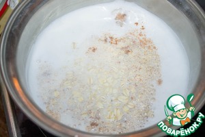Молоко наливаем в кастрюлю и ставим на огонь. В закипевшее молоко кладем оставшийся сахар, корицу, хлопья.