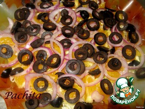Выложить в салатник капусту, апельсины, лук и маслины. Полить соусом.