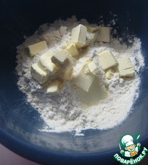 В миске смешать муку и соль. Добавить кусочки холодного сливочного масла, перетереть руками в крошку. -