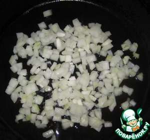 Репчатый лук нарезать мелким кубиком и обжарить на растительном масле до золотистого цвета. -
