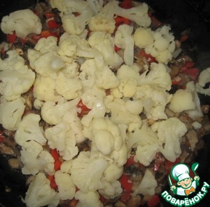 Добавить цветную капусту, перемешать, приправить овощи солью и перцем по вкусу. Снять с огня, дать овощам остыть.