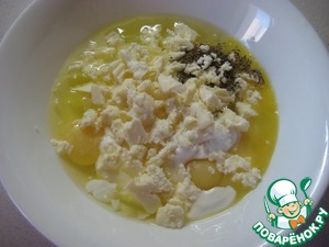 Для заливки смешать в мисочке яйца+белок, оставшийся от приготовления теста, сметану, раскрошенный небольшими кусочками адыгейский сыр, добавить соль и перец по вкусу, тимьян. Хорошо перемешать.