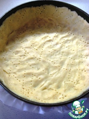 Охлажденное тесто раскатать в круг по размеру формы (диаметр формы 20 см), аккуратно перенести его в форму, затем сформировать из теста бортики 3,5-4 см (я делала это руками). Наколоть тесто в форме вилкой и отправить в разогретую до 180 градусов духовку выпекаться минут 5-7.