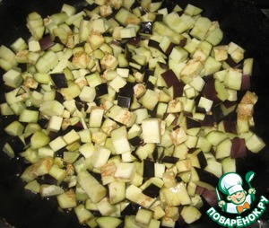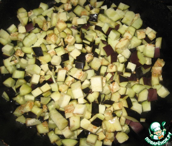 Нарезать мелким кубиком баклажаны, обжарить на небольшом количестве растительного масла на небольшом огне. -