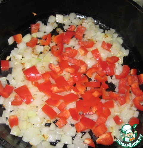 Как только лук станет золотистым, добавляем нарезанный болгарский перец. Обжариваем 2-3 минуты.