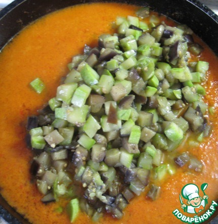 Добавляем обжаренные баклажаны и кабачки. Регулируем по вкусу на соль и перец.