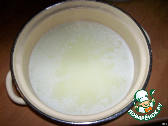 Далее берем нашу кастрюлю со сквашенным молоком (это, кстати, и есть простокваша - и ее можно уже употреблять, она тоже вкусная)и ставим ее на средний или чуть меньше среднего нагрев под закрытой крышкой. Периодически заглядываем и смотрим, как сгусток простокваши начинает уплотняться, а со дна и боков кастрюли отделяется прозрачная сыворотка. Нагреваем первый раз минут 15 -20 до температуры около 60 С, потом выключаем и оставляем до полного остывания массы. Этот этап нужен для увеличения выхода готового продукта.