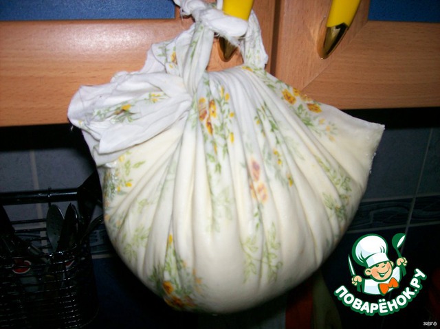 Подвешиваем частично стекший творог на 4-6 часов в прохладном месте.