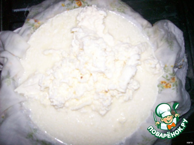 Снова ставим на нагрев, сгусток начнет распадаться на отдельные комья. Нагревать надо медленно и равномерно, не допуская кипения сыворотки. Если сыворотка закипит, творог у Вас переварится и будет сухой и рассыпчатый. В общем когда вся масса распадется на небольшие фрагменты, а сыворотка будет прозрачной и слегка зеленоватого оттенка - можно выключать. Снова даем остыть до комнатной температуры и выливаем всю массу в заранее подготовленный большой дуршлаг, выстланный марлей в 2 слоя или х/б тканью и поставленный в чашку или тазик. Даем сыворотке стечь, связываем марлю узелком и подвешиваем над емкостью на 4 -5 часов. После чего можем наслаждаться собственноручно изготовленным творогом в натуральном виде, или готовить из него любимые блюда. Лично я предпочитаю свой творог съедать просто так, а для готовки покупаю магазинный.