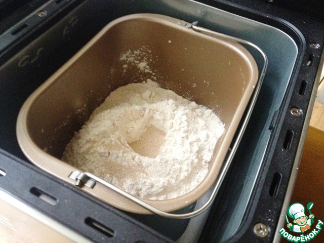 Выложить в хлебопечку ингредиенты в следующем порядке: