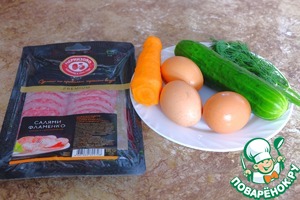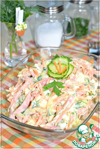 Предлагаю вам, уважаемые поварята, приготовить этот простой и вкусный салат, в котором острая нотка сырокопченой колбасы уравновешивается свежестью огурца и моркови.