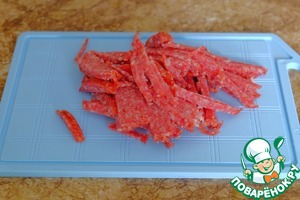 Сырокопченую колбасу (нарезка) порезать тонкой соломкой.