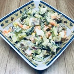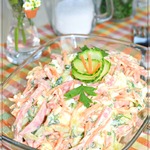 Небольшие замечания: салат вкуснее, если постоит с полчаса и продукты "подружатся". Огурец даёт сок! И это надо точно учитывать, если готовить заранее. Пргитовила в полдень, съели половину, а в 7 вечера салат уже "плавал"
