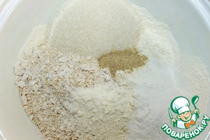 • В глубокой миске смешиваем просеянную пшеничную и рисовую муку, измельченные хлопья, сахар, разрыхлитель, соль и кардамон. Перемешиваем.