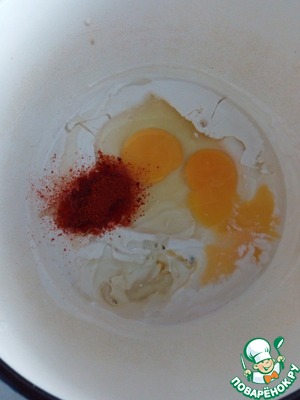 В активировавшиеся дрожжи вводим яйца, копченую паприку и масло, перемешиваем.