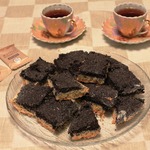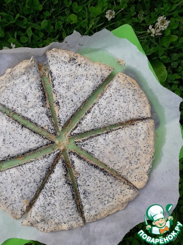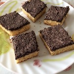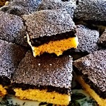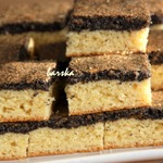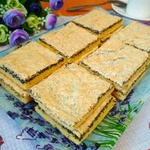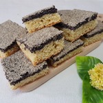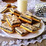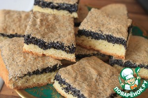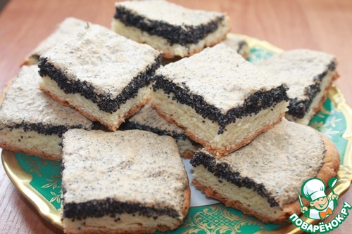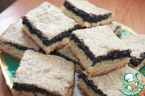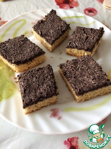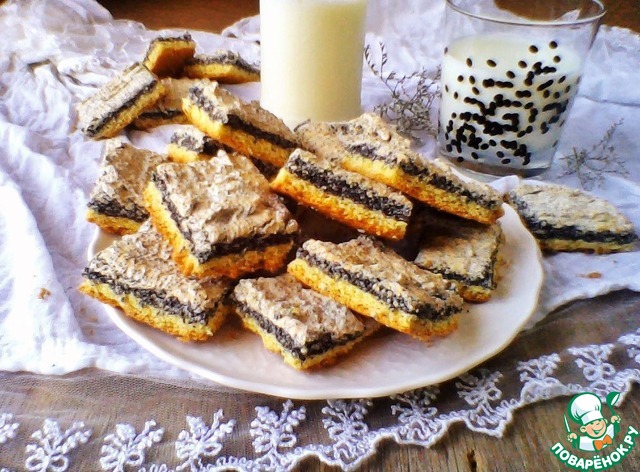 Тесто раскатать в пласт, выложить на противень, застеленный бумагой для выпечки, и покрыть белково-маковой массой. Выпекать при 180 градусах 20 минут. Готовый, чуть остывший пласт разрезать на квадратики.