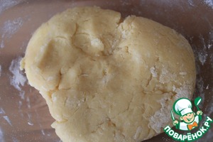 Белок отделить от желтка, желток растереть с половиной сахара, мягким сливочным маслом, сметаной, мукой и разрыхлителем. Замесить тесто и убрать на 30 минут в холодильник.