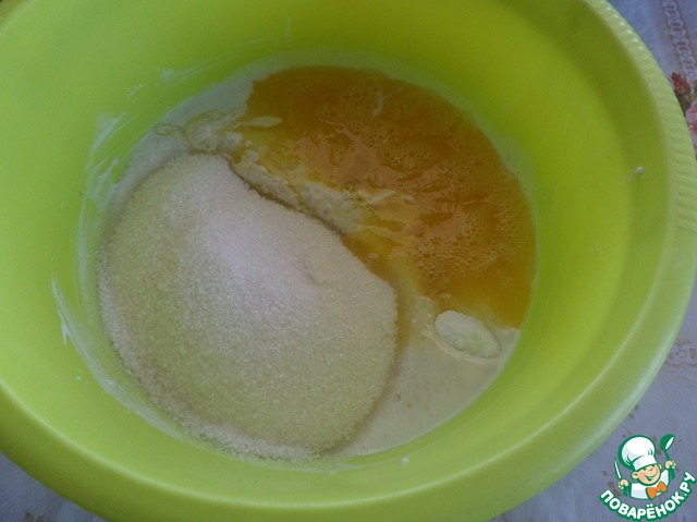 В чашку к набухшим отрубям добавляем сахар и взбитые яйца. Хорошо перемешиваем.