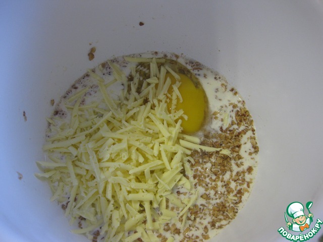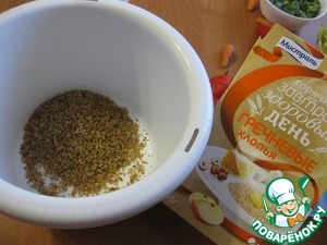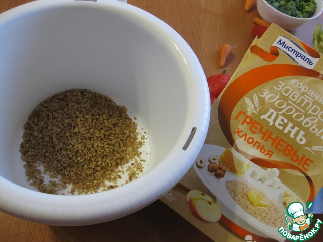 Для начала мы подготовим заливку для нашей запеканки, - возьмем стакан гречневых хлопьев от Мистраль, высыпем в миску