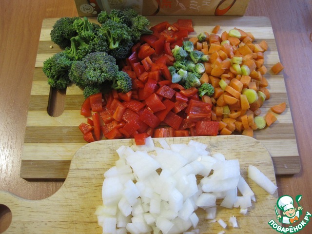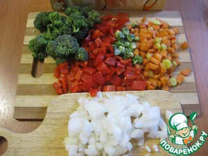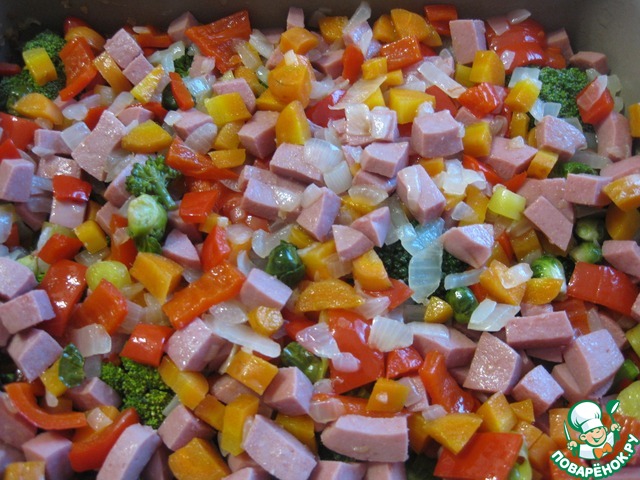 Все овощи подготовлены, помыты), - брокколи разберем на соцветия, лук, перец, морковь и колбасу нарежем мелким кубиком.