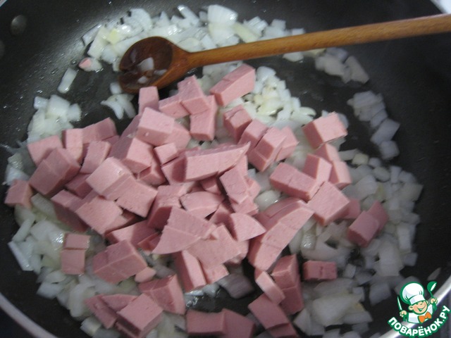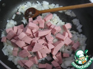 Разогреваем сковороду с маслом, добавляем лук и колбасу, обжариваем до легкой прозрачности лука