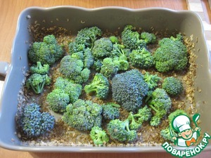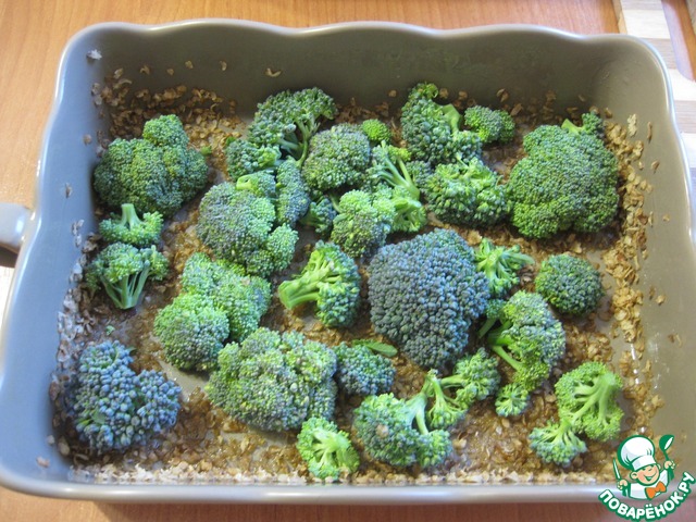 Форму для запекания чуть смажем маслом и посыпаем гречневыми хлопьями