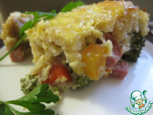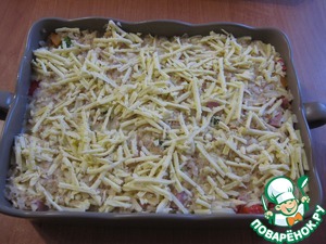 Зальем овощи заливкой, слегка распределяя ее ложкой между овощами, и поверх натрем сыр на крупную терку, для красивой корочки.