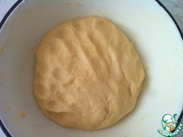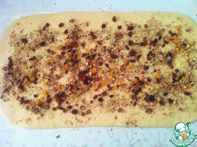 Подошедшее тесто надо раскатать в прямоугольник толщиной прибл. 0,5 см