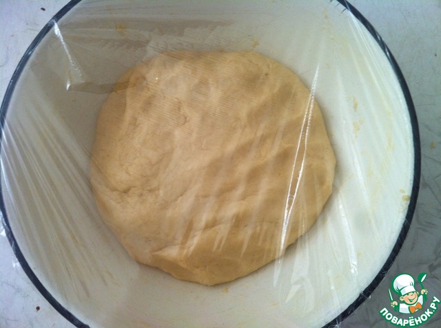 Тесто накрываем пищевой пленкой и оставляем на 30 минут, пусть увеличится в обьеме