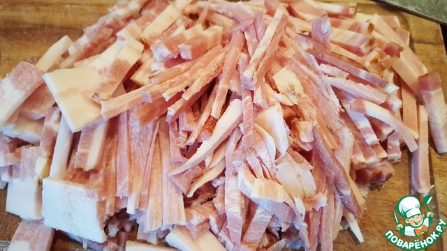 Выложить к луку грудинку, слегка обжарить и добавить нарезанное отварное мясо. Влить соевый соус, поперчить, потушить минут 5. Попробовать на соль и специи и отрегулировать на свой вкус.