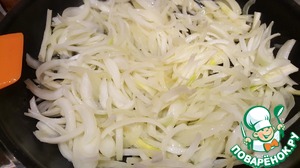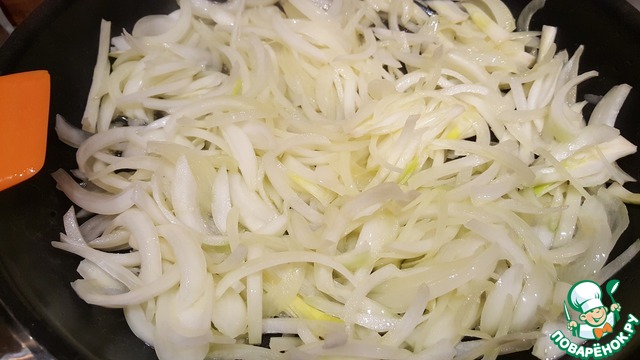 Лук нарезать перьями, выложить на сковороду к растопленному жиру и обжарить до прозрачности.
