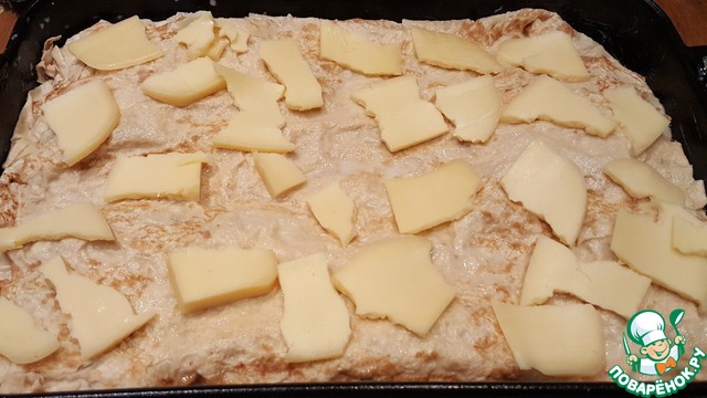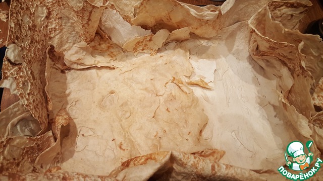 Смазать маслом форму для запекания. Выстелить дно сухим лавашом, формируя бортики и оставляя края для заворачивания.