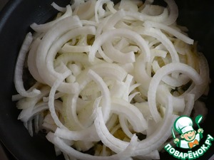 Растопить на сковороде топленое масло. Нарезать лук тонкими полукольцами и обжарь до мягкости.