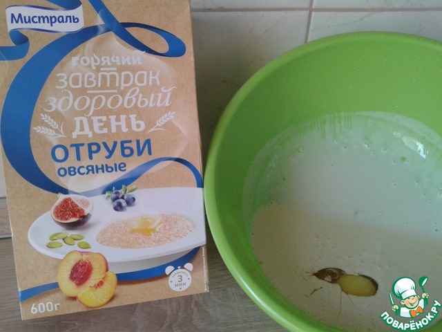 Смешиваем в миске ряженку, яйцо и соль, достаем секретный ингредиент - овсяные отруби "Мистраль" и ставим коробку на видное место. Так наша совесть примиряется соседством слов "пицца" и "полезное тесто" :).