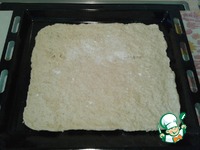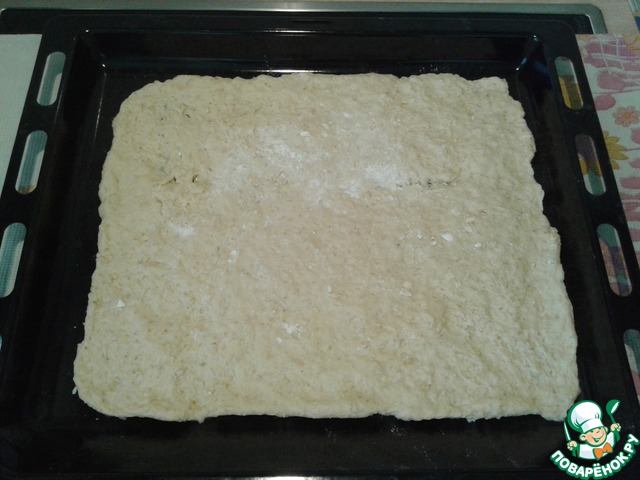 Раскатываем тесто на противень в пласт толщиной примерно 0,7 см.