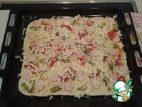 Смазываем тесто кетчупом. Нарезаем ингредиенты для начинки, выкладываем в произвольном порядке. Сверху посыпаем тертым сыром.