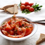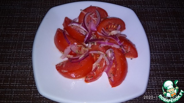 Наступила осень, и на прилавках снова появились «зимние» помидоры: толстокожие, твёрдые и безвкусные. Как сделать их вкусными и сочными, уже писал, теперь приготовим такую же простую и лёгкую закуску-салат.