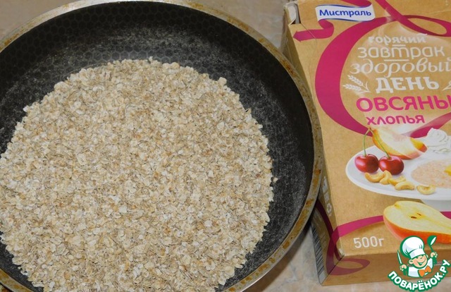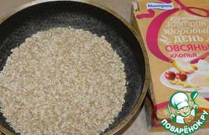 Овсяные хлопья немного обжарить, постоянно помешивая. Не надо доводить их до того, чтобы они начали темнеть. Достаточно их хорошо просушить, прогреть, пока появится характерный обжаренный запах. Затем хорошо измельчить.