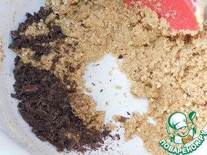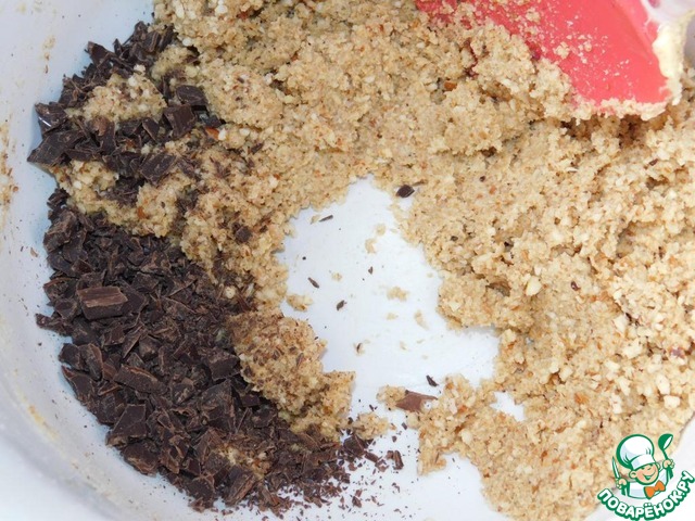 Затем всыпаем в тесто молотый миндаль и порубленный на кусочки шоколад.